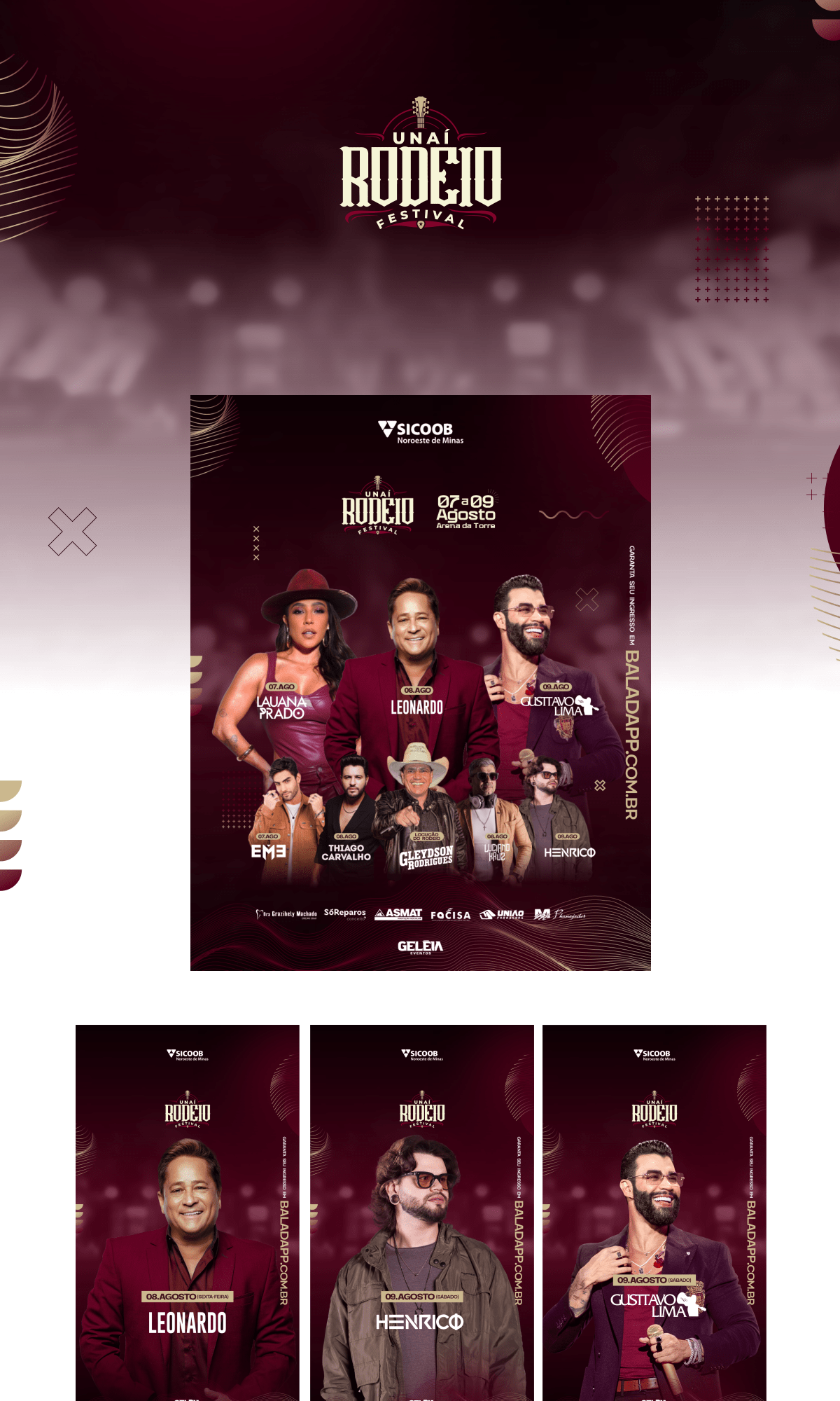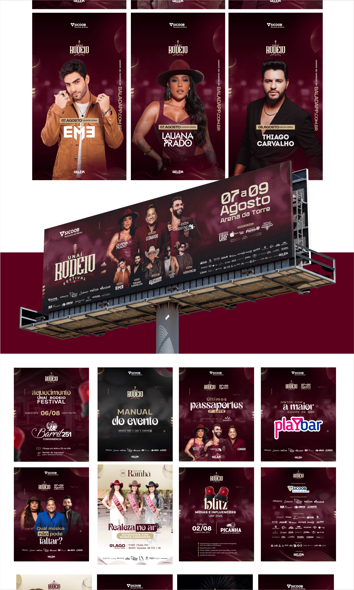 Desde o início do planejamento, a estratégia foi criar uma identidade visual sólida, marcante e coerente com a grandiosidade do festival. A paleta de cores, tipografia, elementos gráficos e aplicação da marca foram desenvolvidos para transmitir força, tradição e modernidade, unindo o universo do rodeio com uma comunicação contemporânea e altamente compartilhável nas redes sociais.